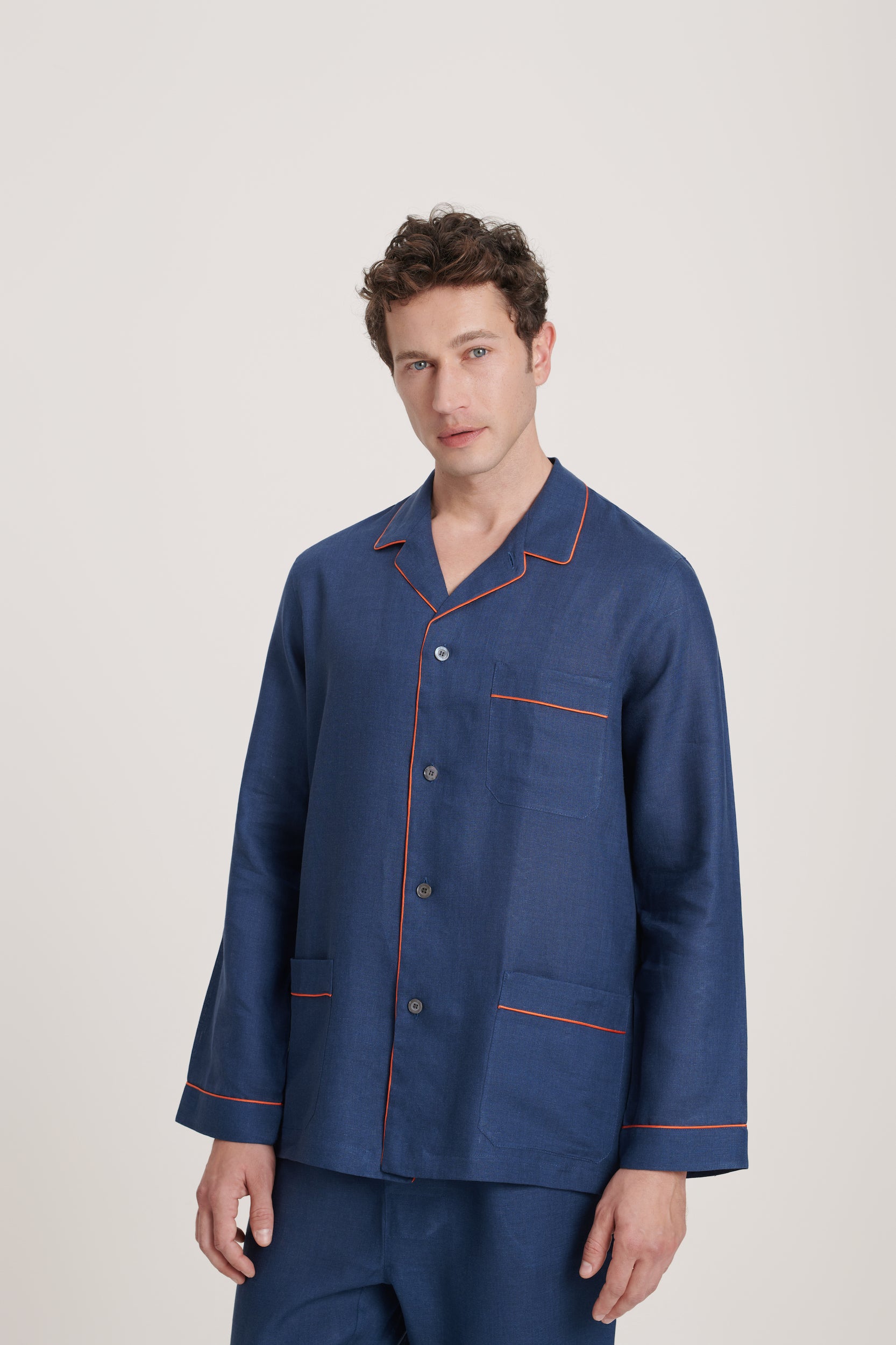 Italian linen pajama in denim blue with tangerine piping. Light, breathable, and relaxed, with subtle charm and a fresh, playful touch. Made in Italy.