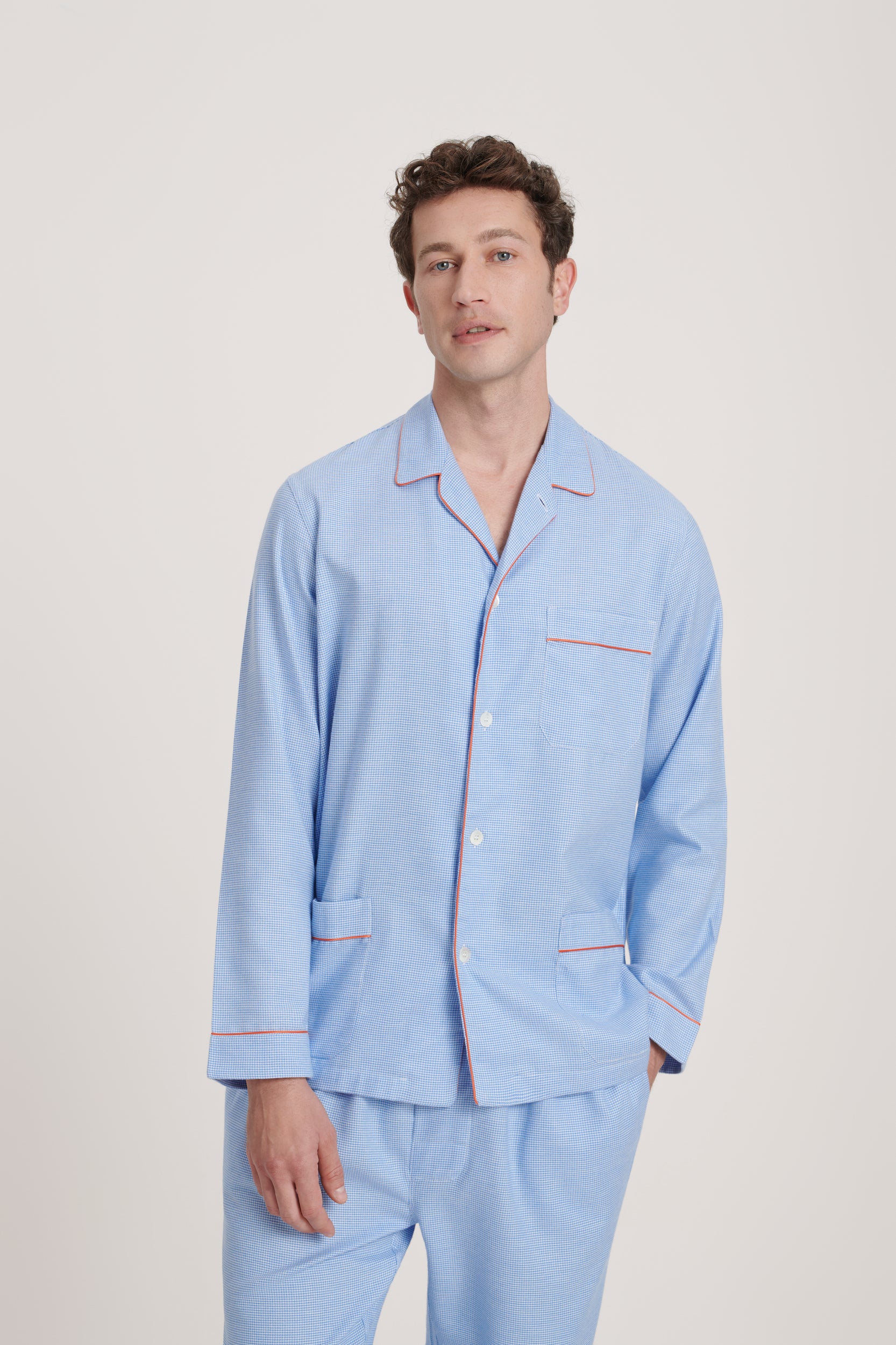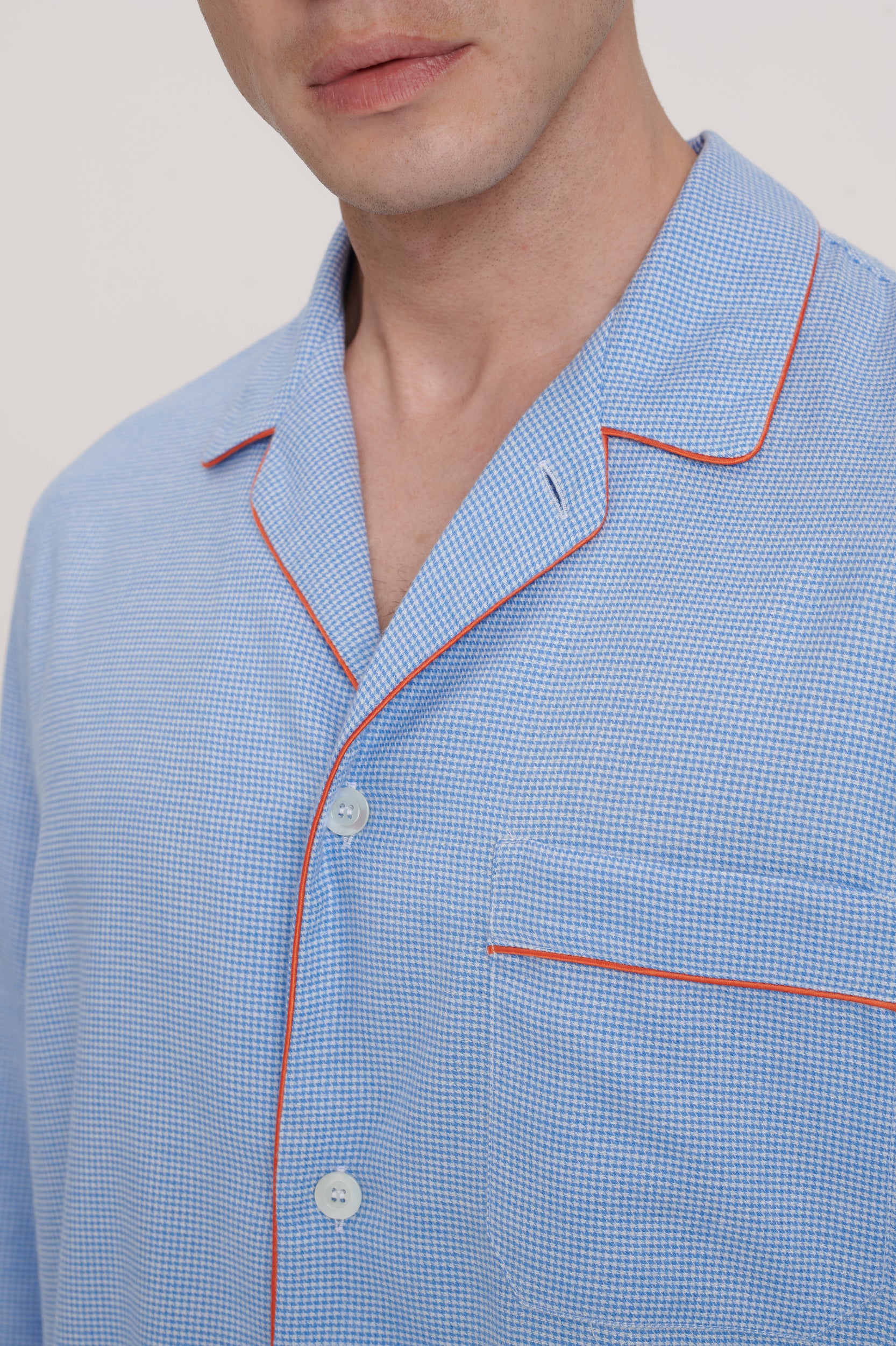 Italian cotton flannel pajama in sky-blue baby houndstooth with tangerine piping. Soft, comfortable, and airy, bringing subtle brightness to everyday wear. Made in Italy.