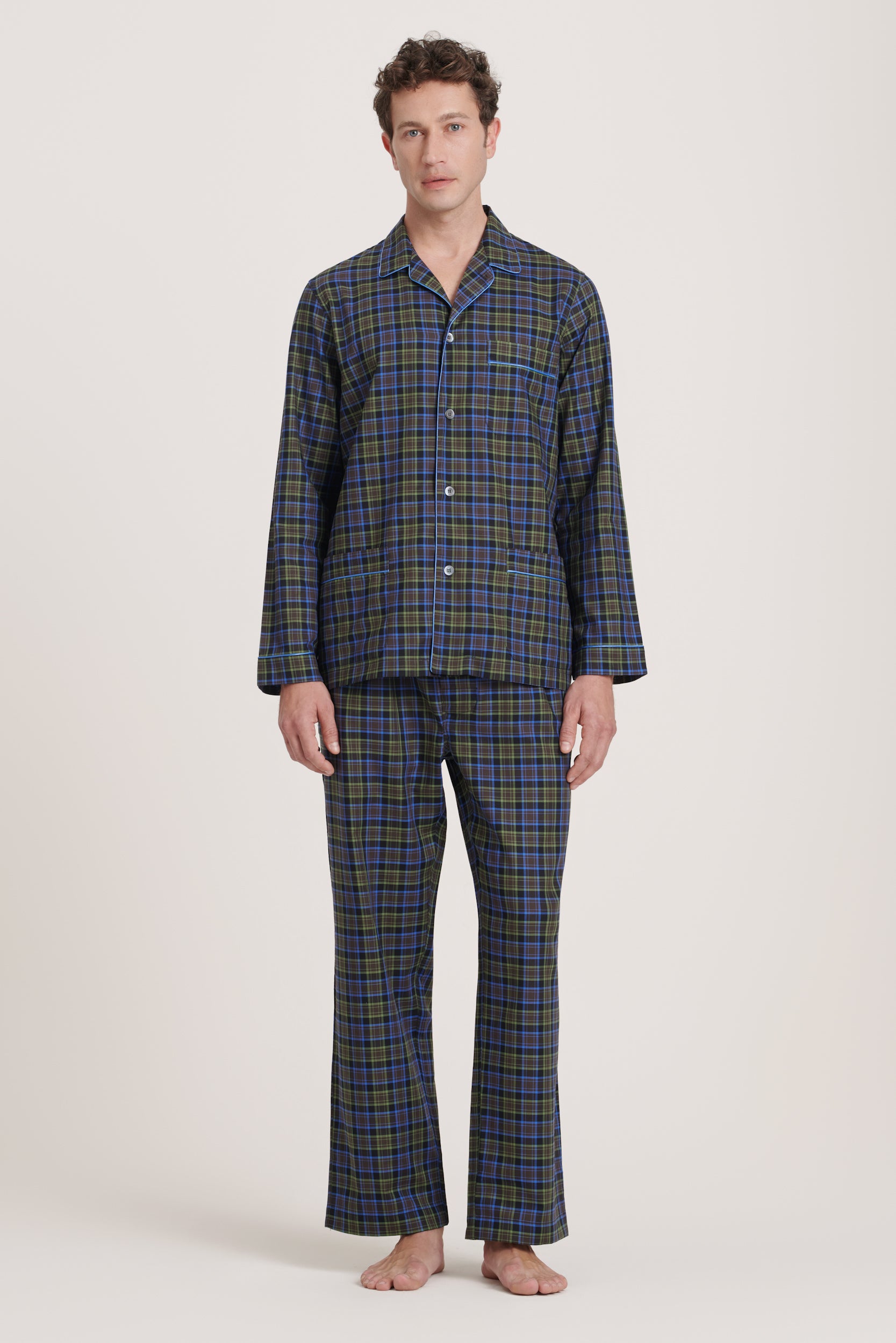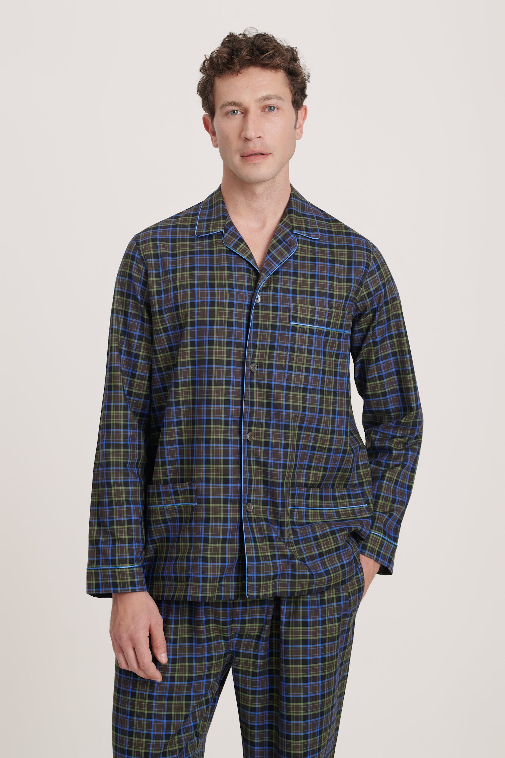 Italian cotton pajama in brown and olive plaid with sky-blue piping. Soft, relaxed, and comfortable, blending earthy warmth with effortless elegance. Made in Italy.