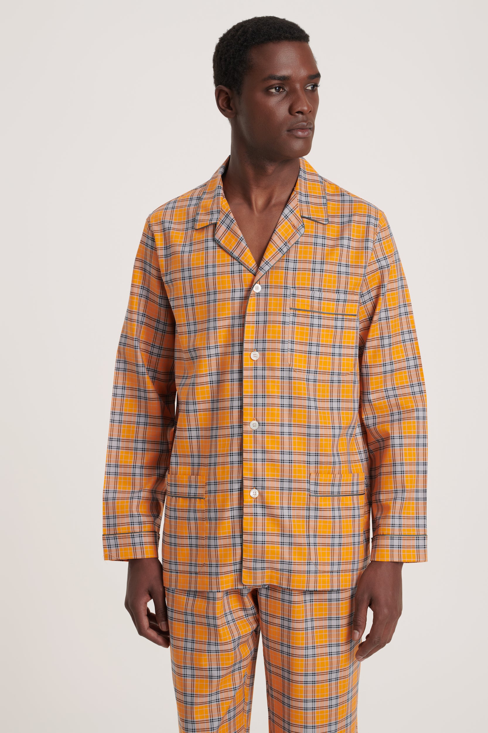 Italian cotton pajama in tangerine and black plaid. Soft, relaxed, and comfortable, with a bold yet polished pattern that adds character. Made in Italy.