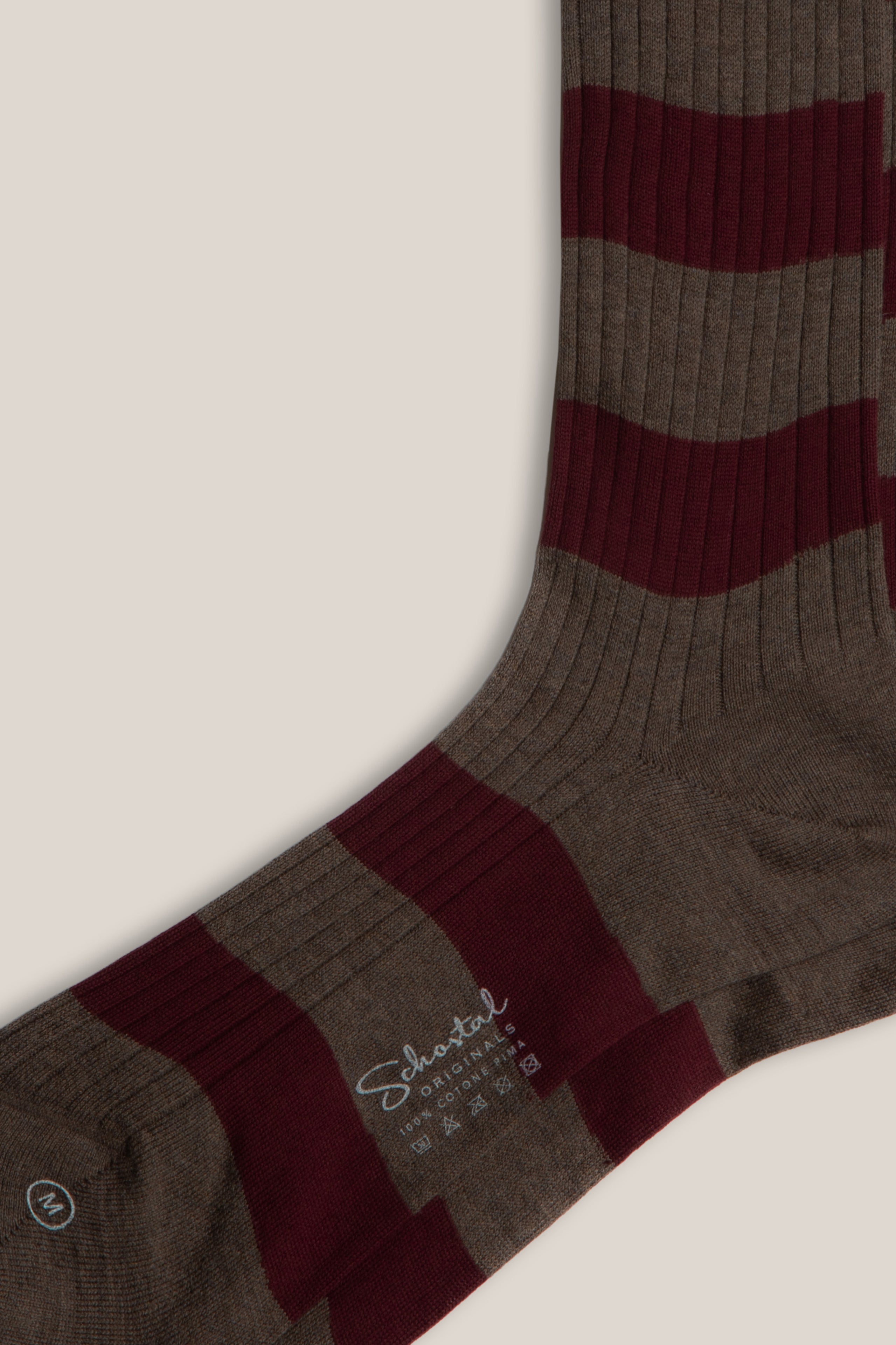 Striped Pima Cotton Ribbed Socks - Extended Mid-Calf - Taupe & Burgundy