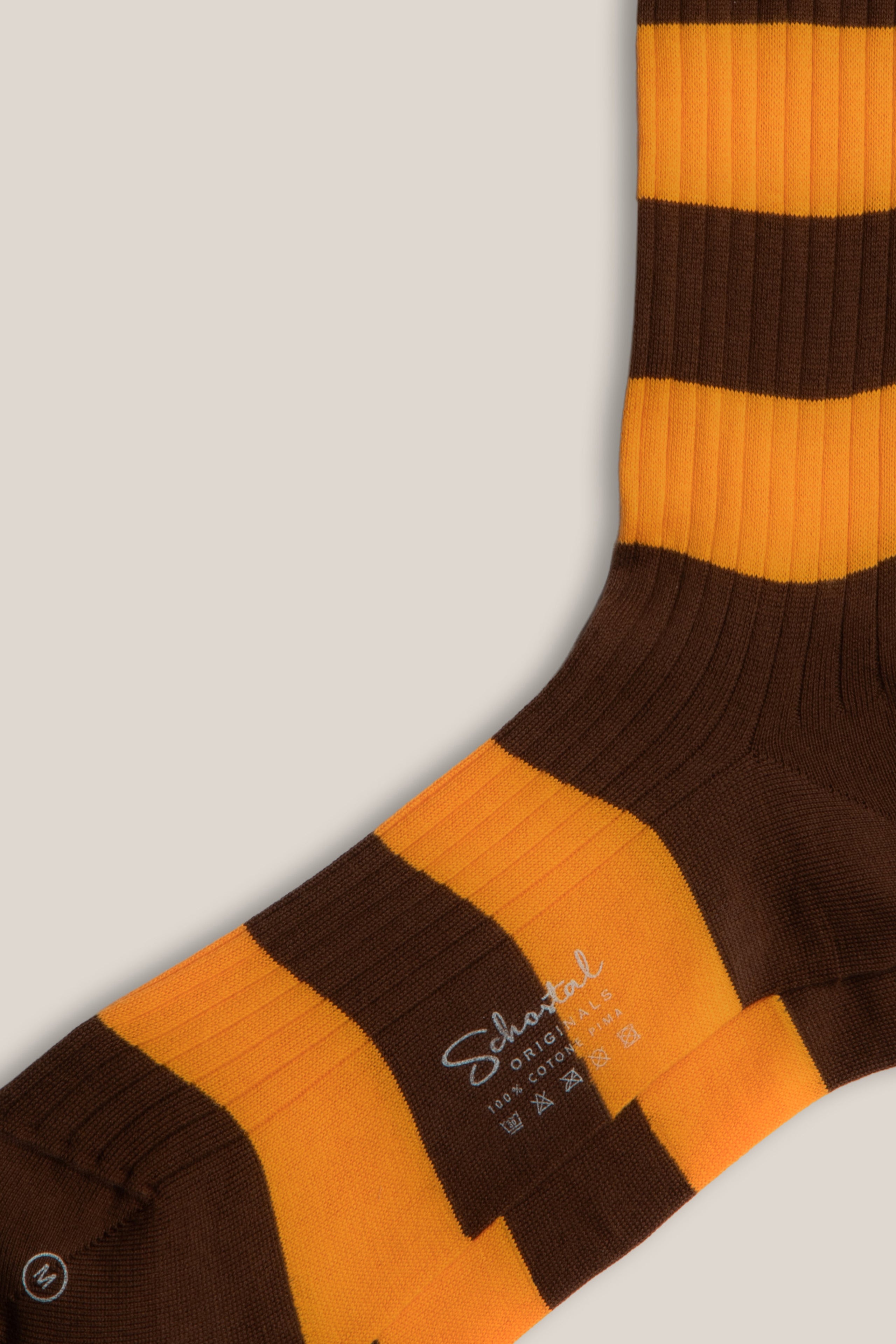 Striped Pima Cotton Ribbed Socks - Extended Mid-Calf - Brown & Mustard