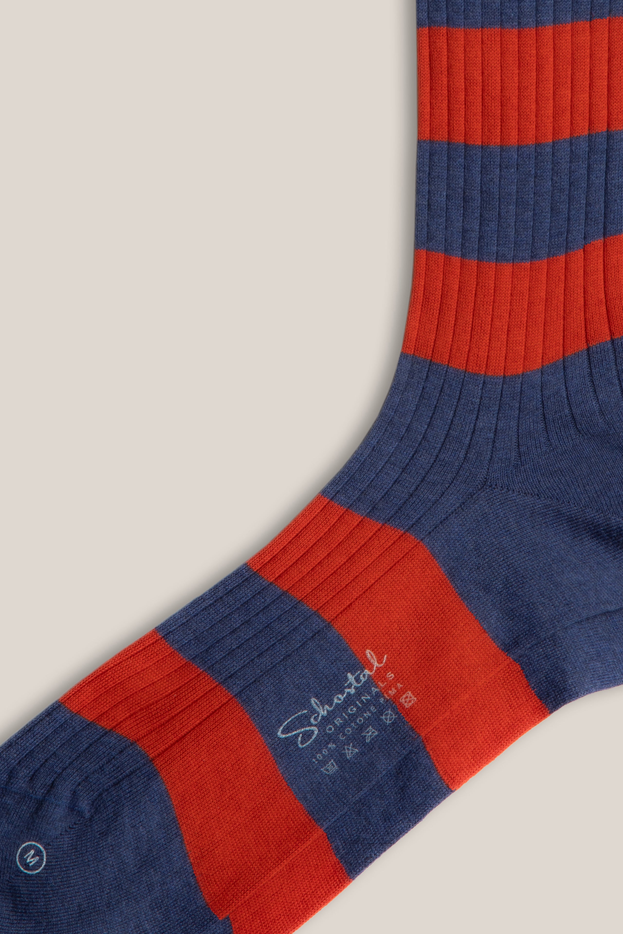 Striped Pima Cotton Ribbed Socks - Extended Mid-Calf - Denim blue & Rust