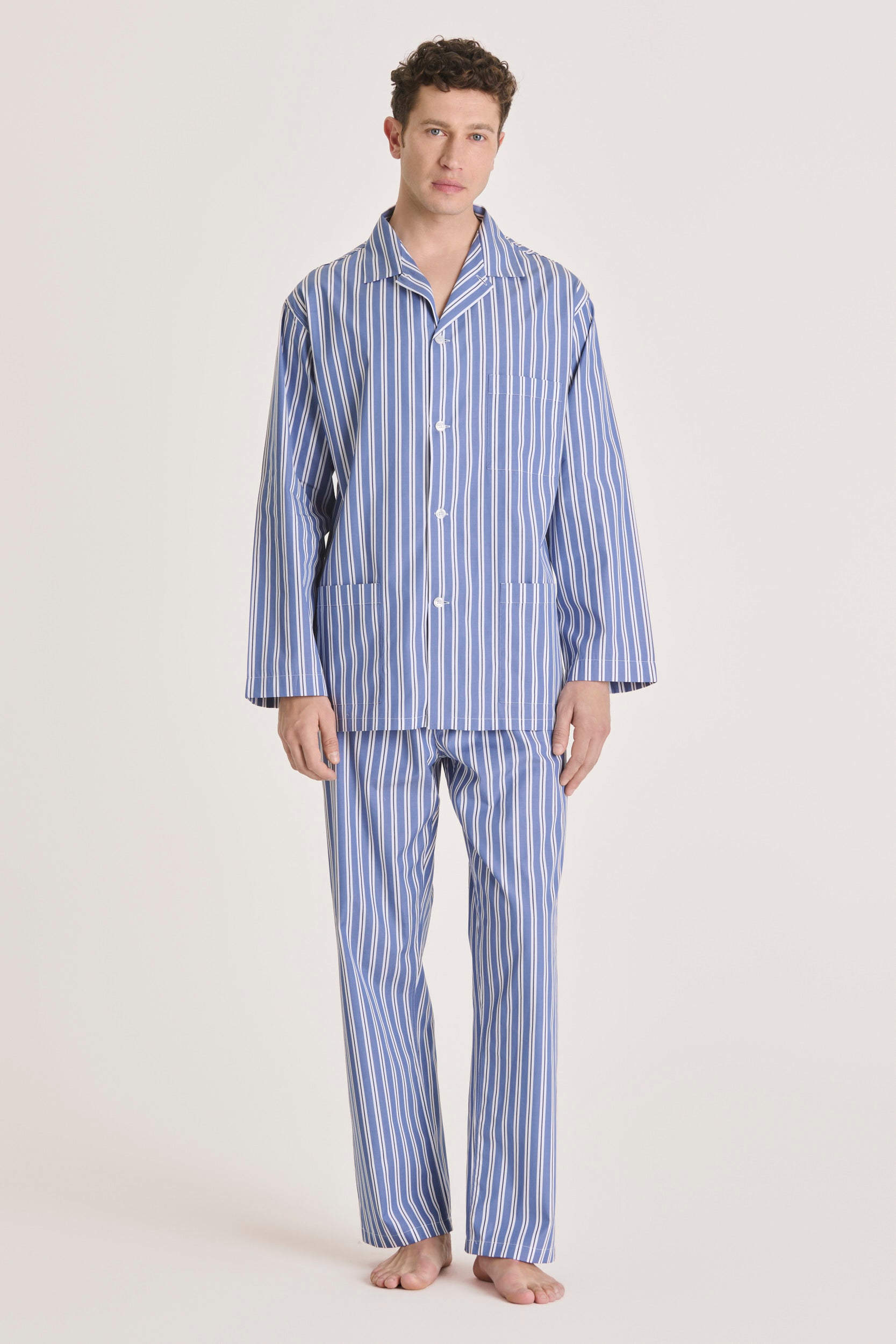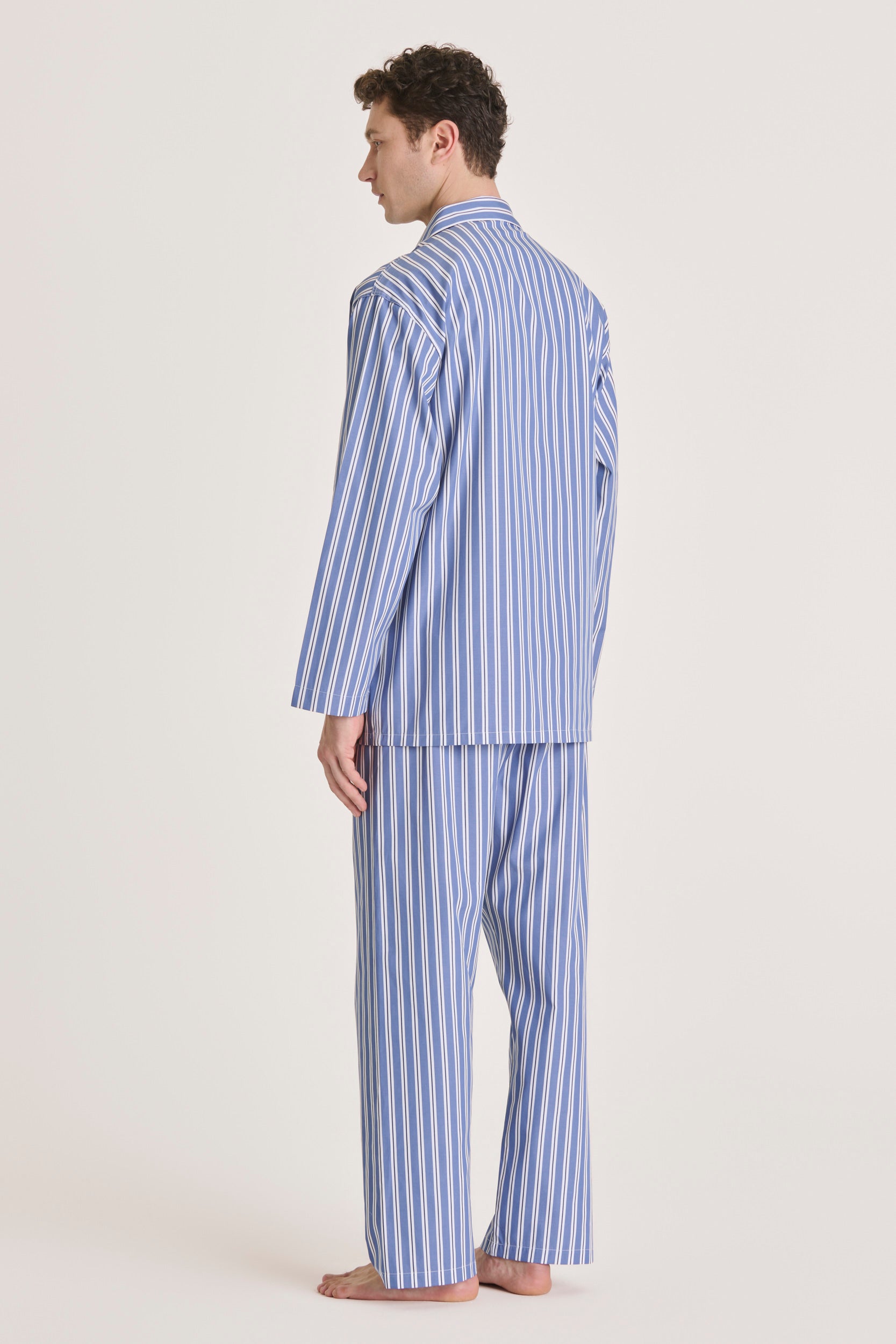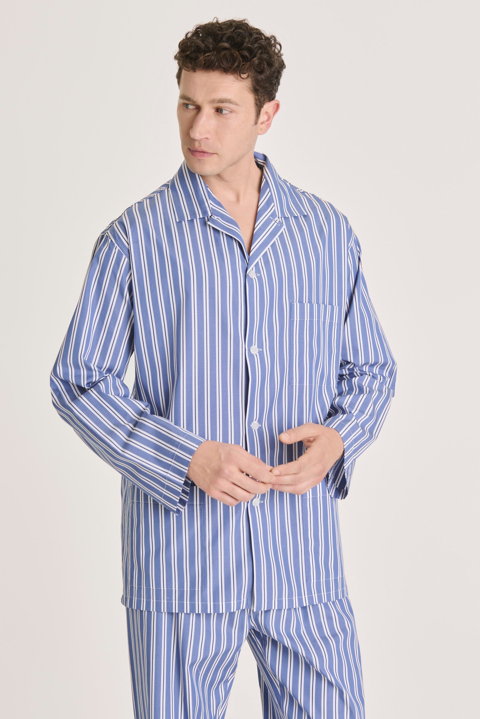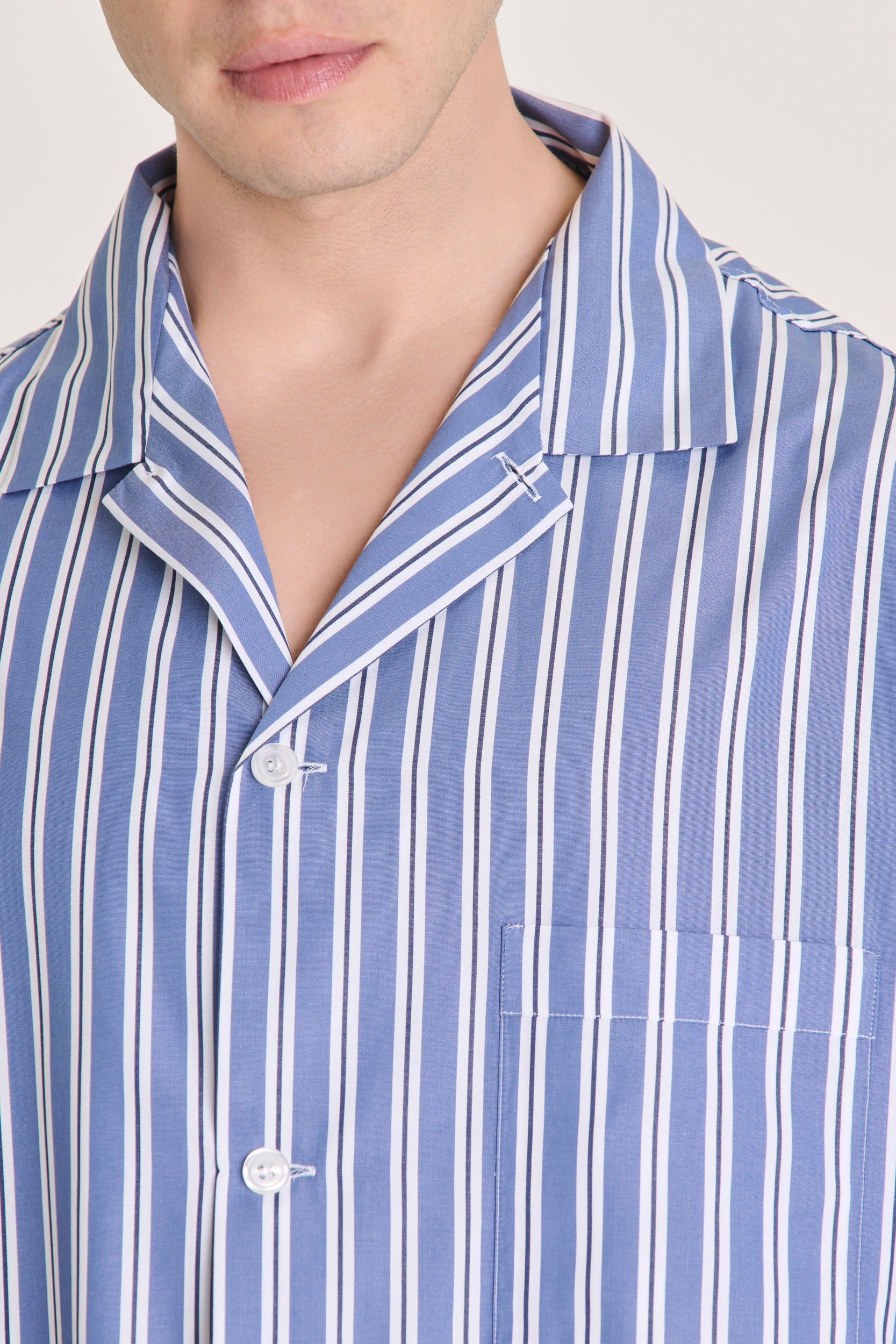 Fresh and considered in its design, this light-blue striped cotton pajama introduces a subtle play of contrast. The white stripe is traced with a fine navy line, adding precision and depth without breaking the overall harmony. With no piping and a clean finish, it relies on detail and proportion, resulting in a pajama that feels elegant, modern, and quietly assured.