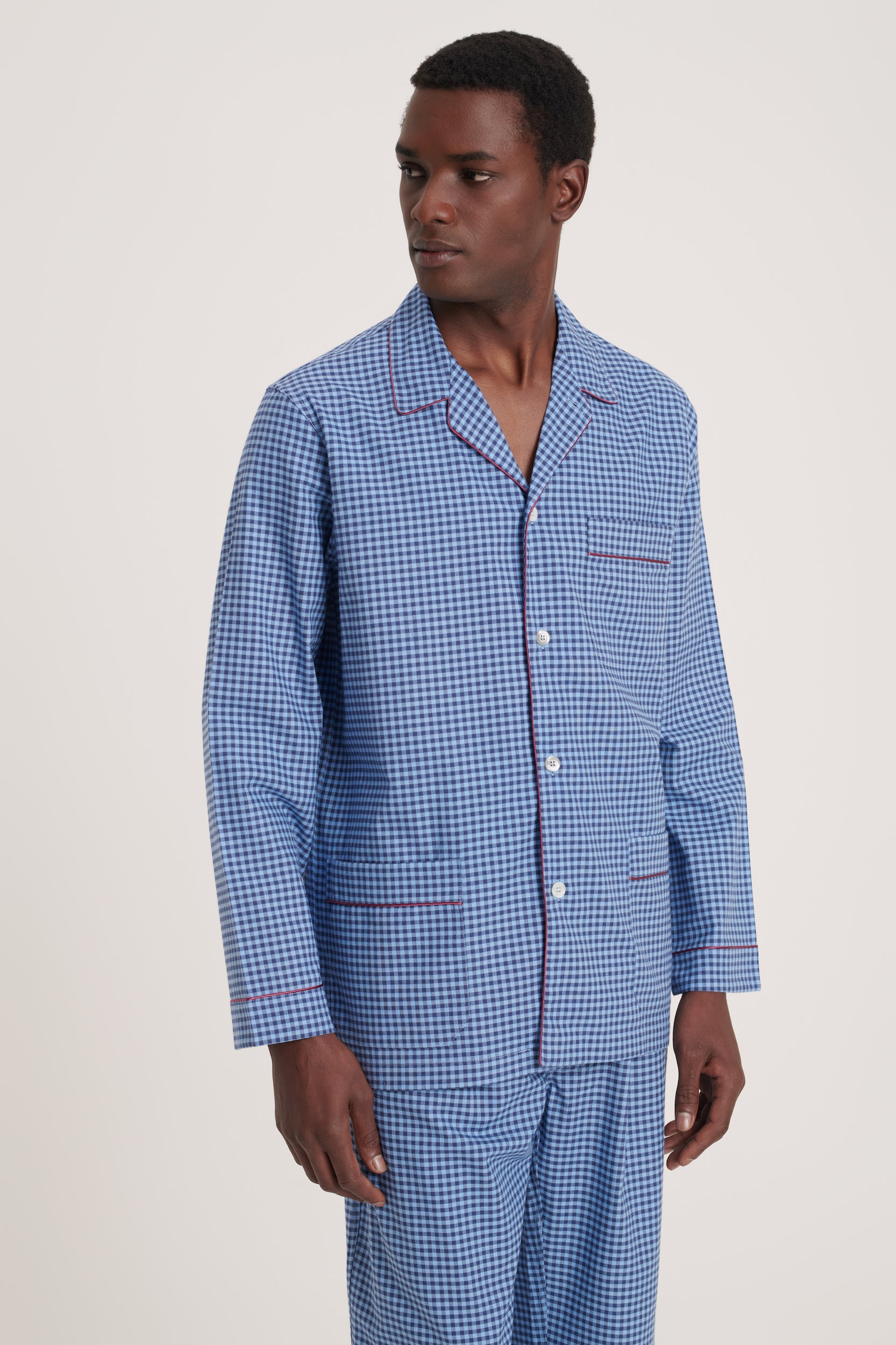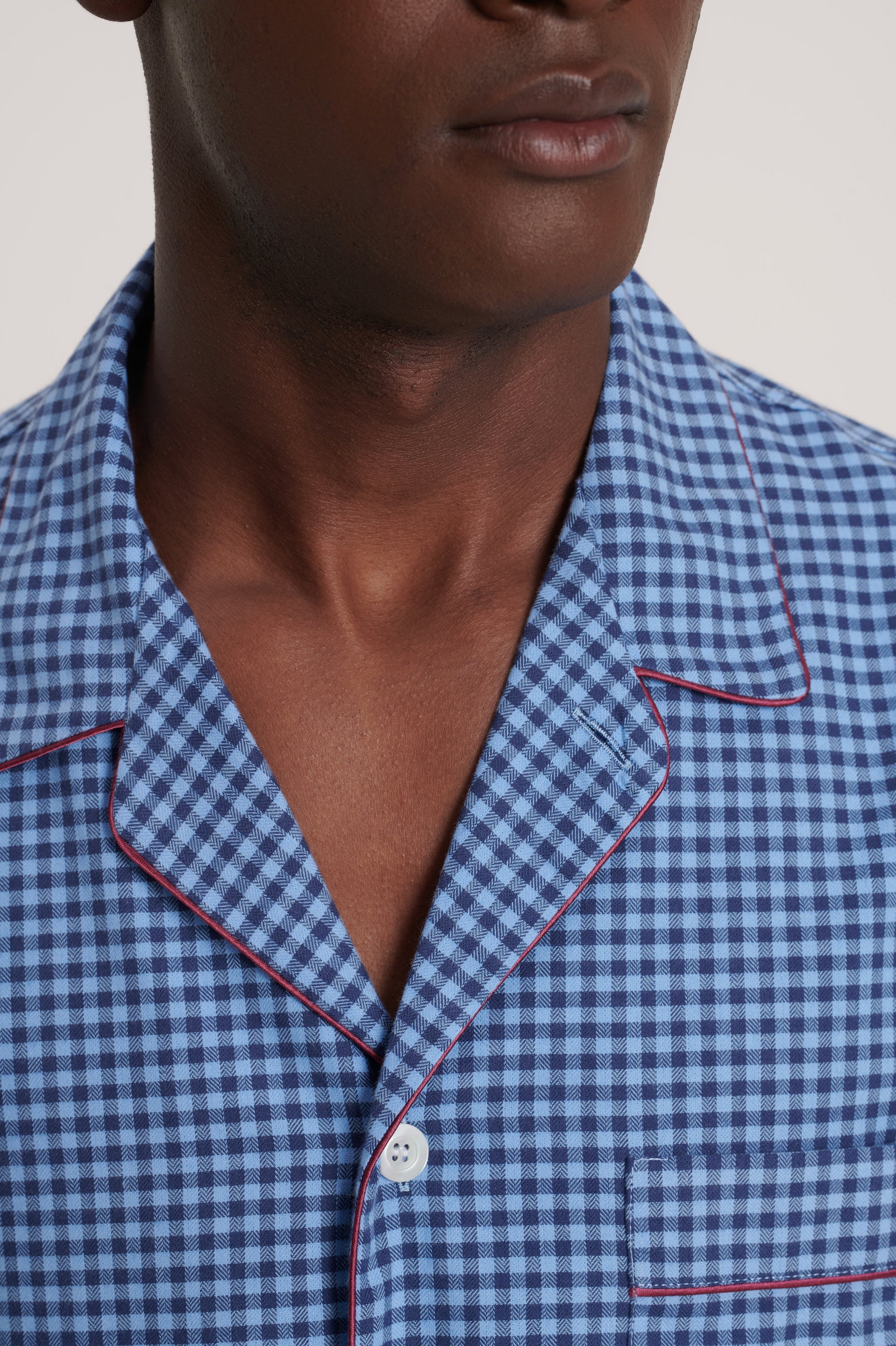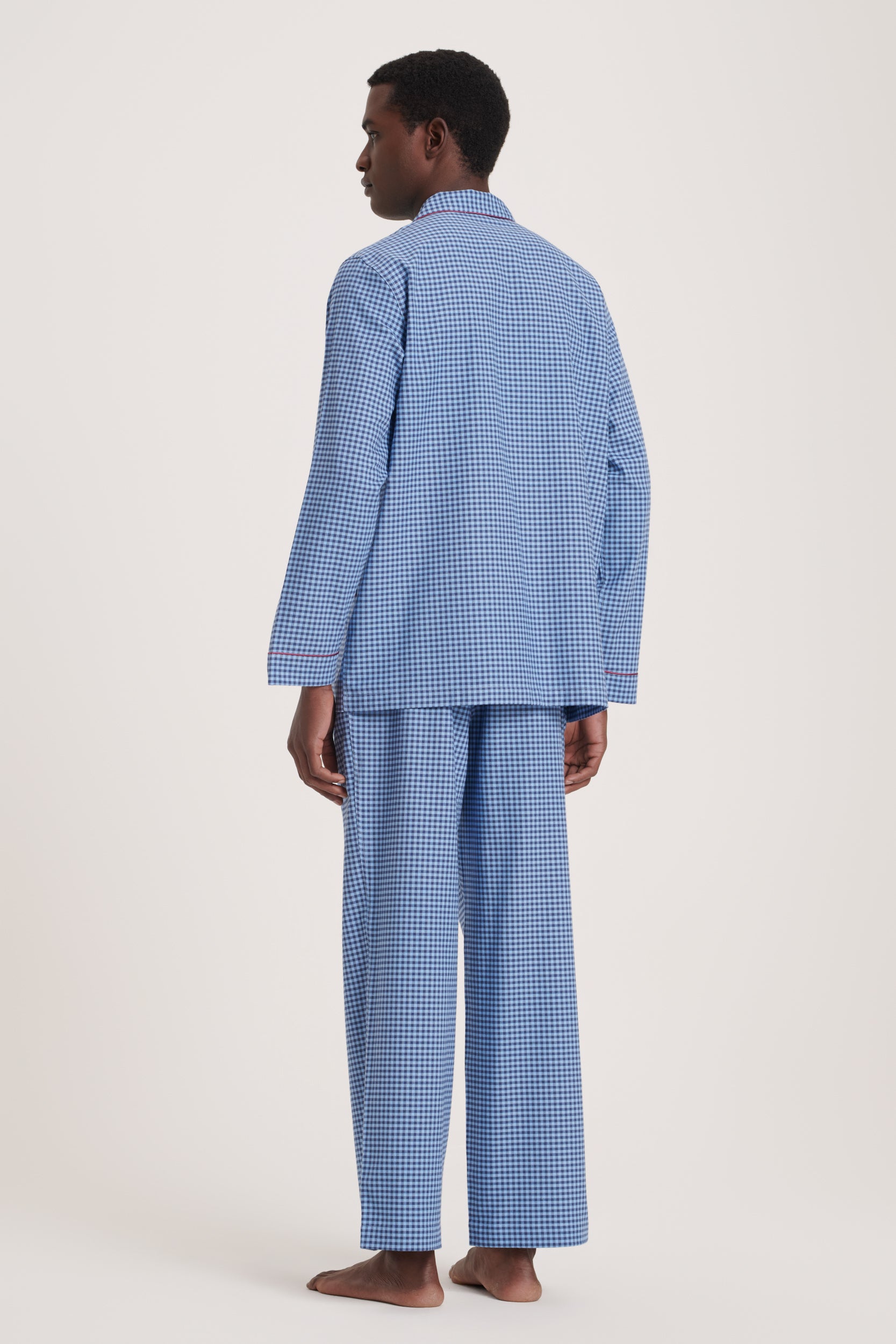 Italian cotton flannel pajama in navy-and-sky gingham with wine piping. Soft, warm, and comfortably draped, bringing classic, refined style. Made in Italy.