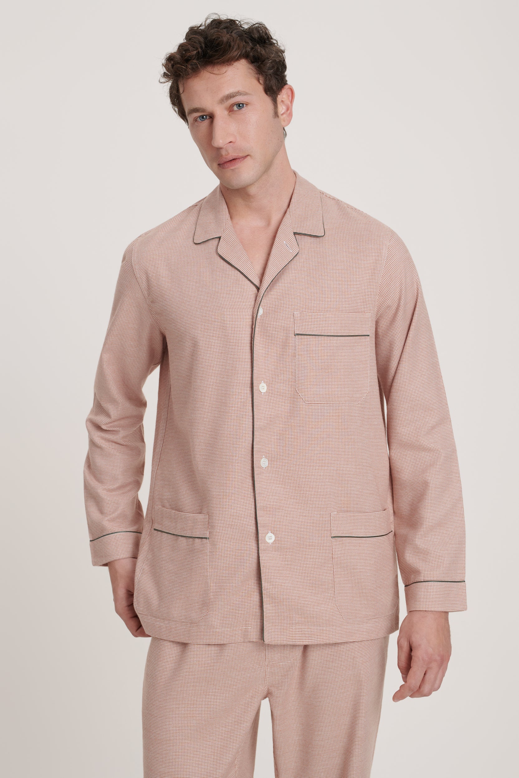 Italian cotton flannel pajama in soft taupe baby houndstooth. Soft, warm, and comfortably relaxed, with an ease character and effortless everyday style. Made in Italy.
