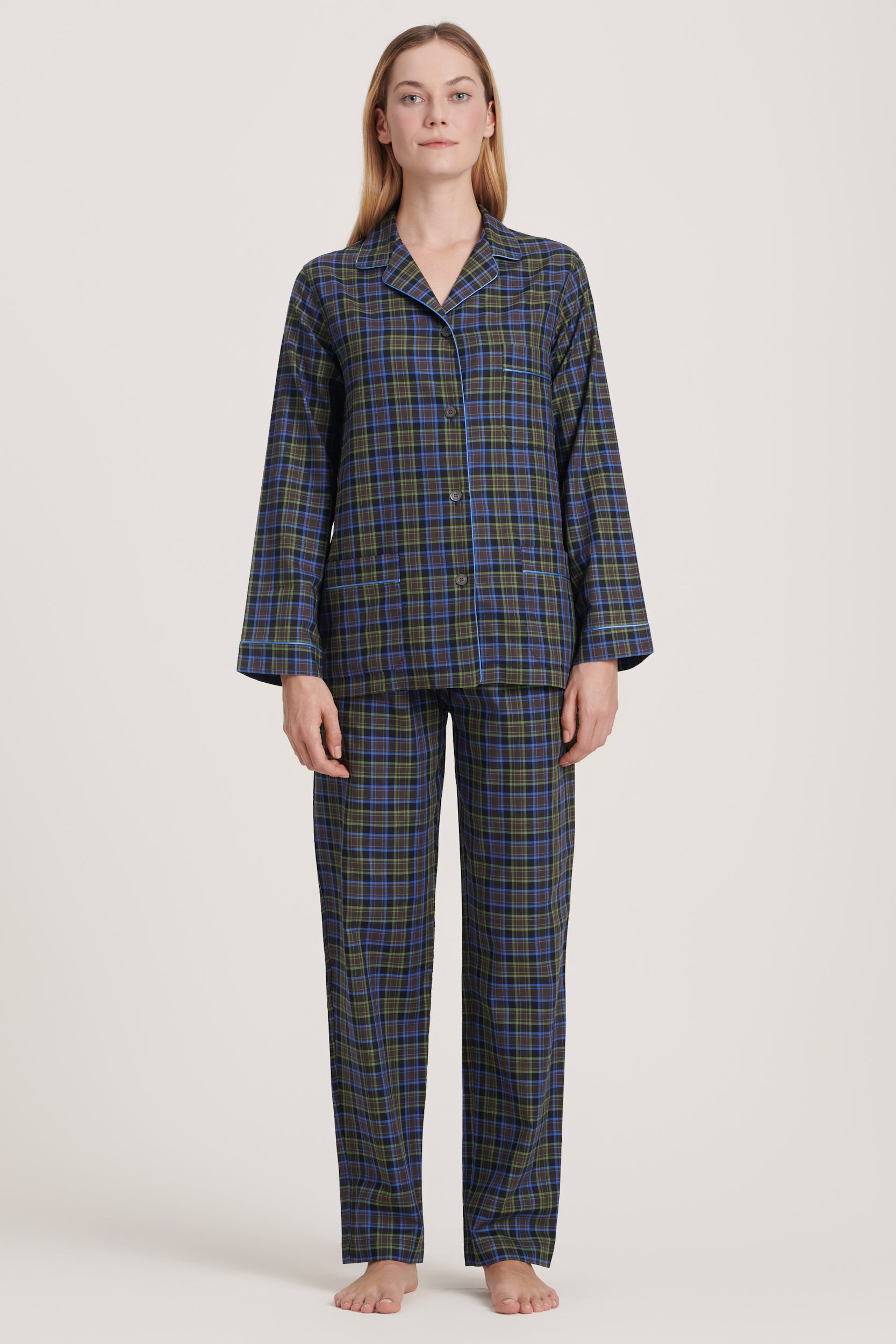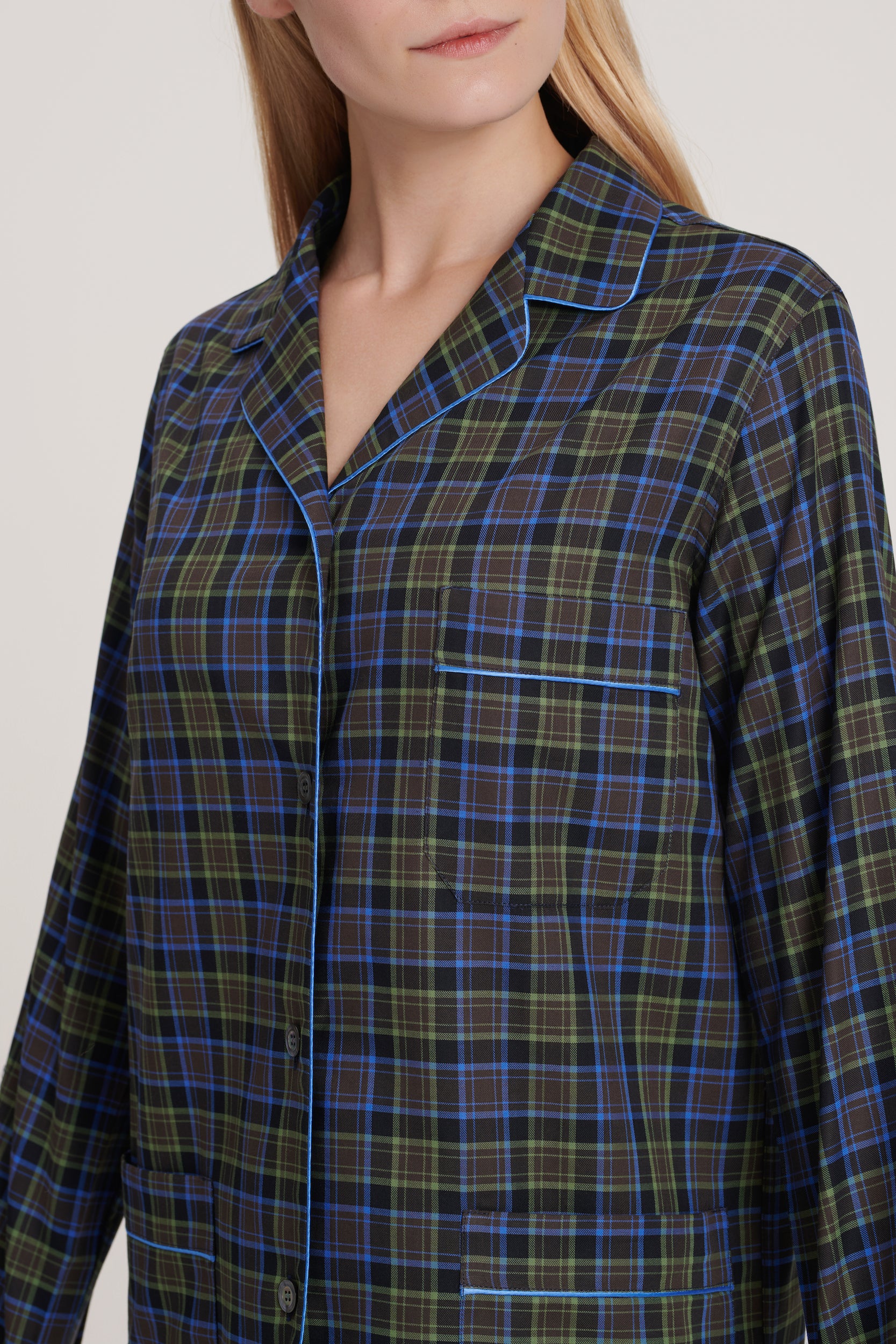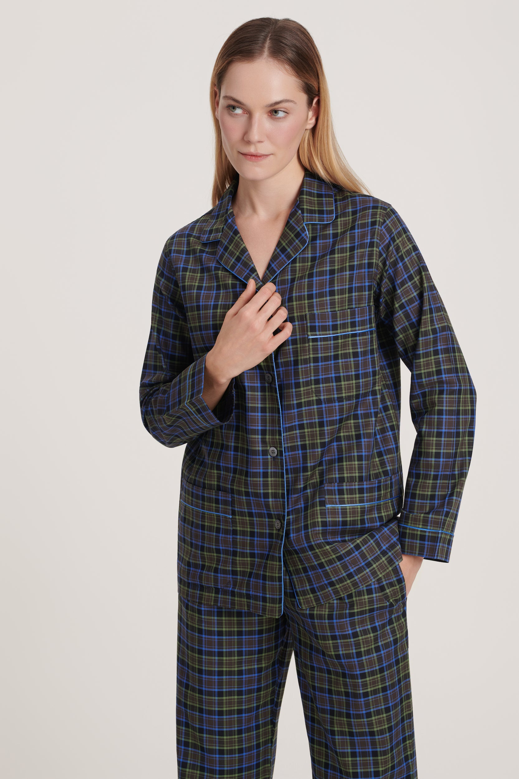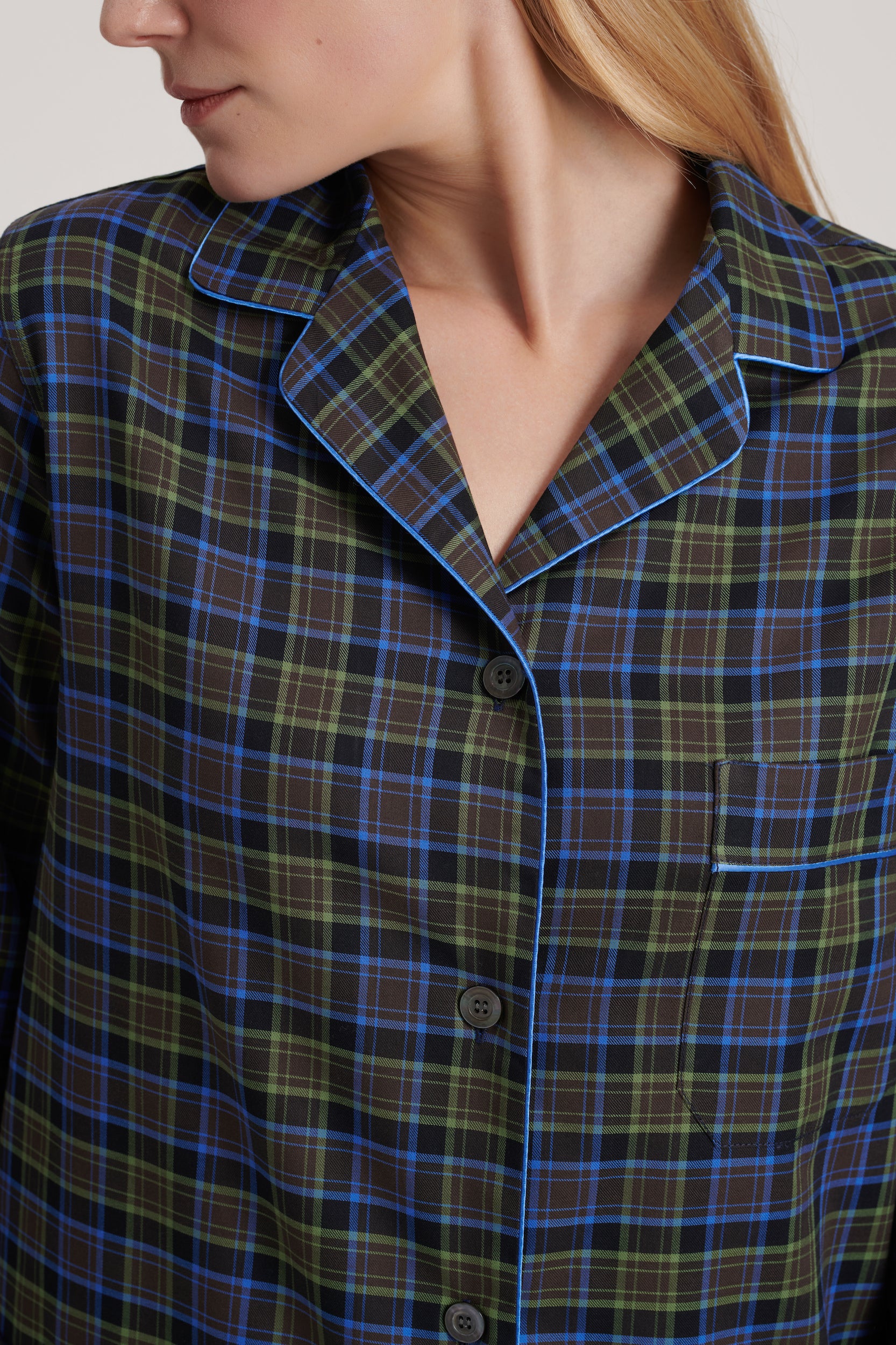 Italian cotton pajama in brown and olive plaid with sky-blue piping. Soft, relaxed, and comfortable, blending earthy warmth with effortless elegance. Made in Italy.