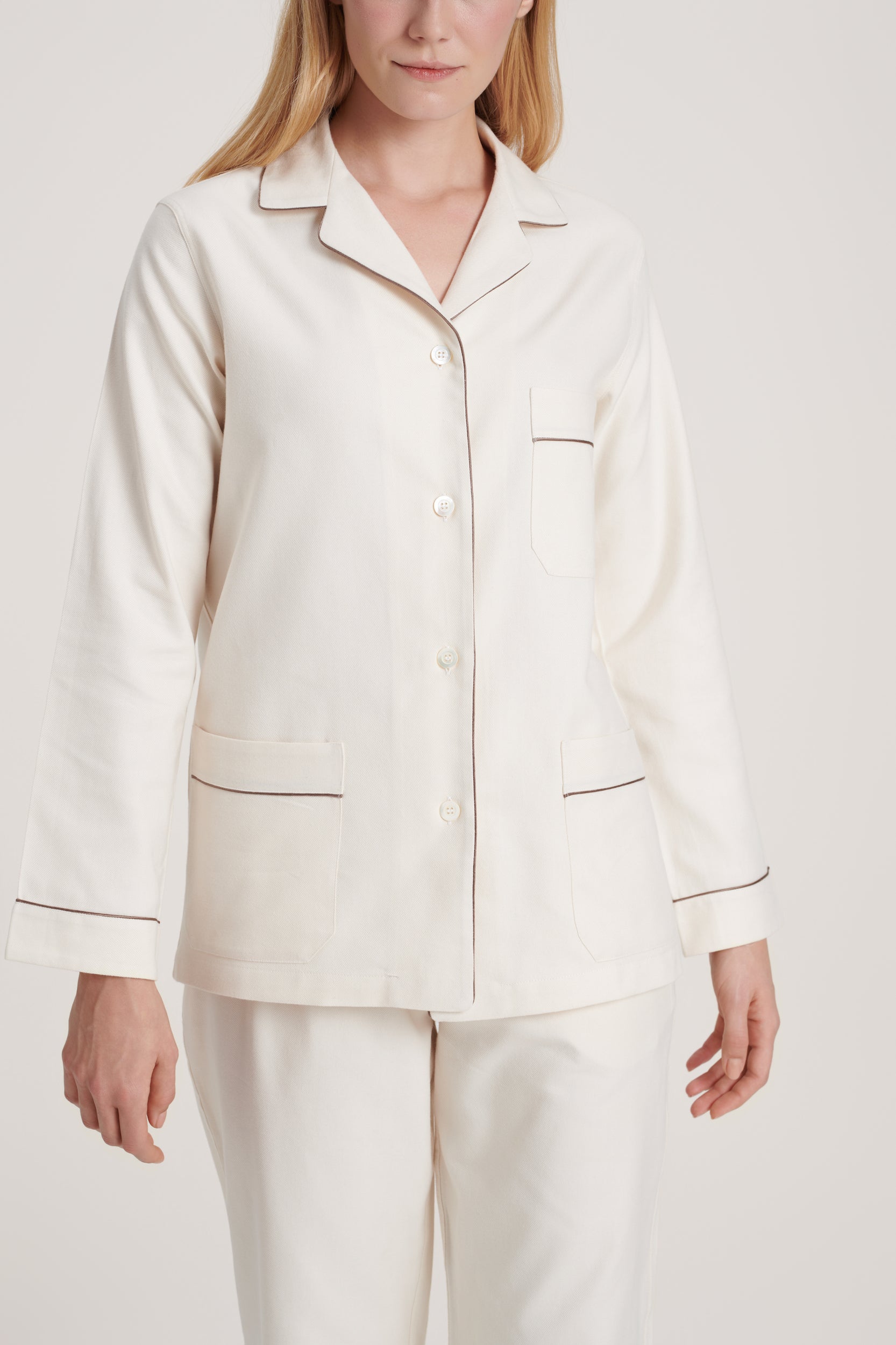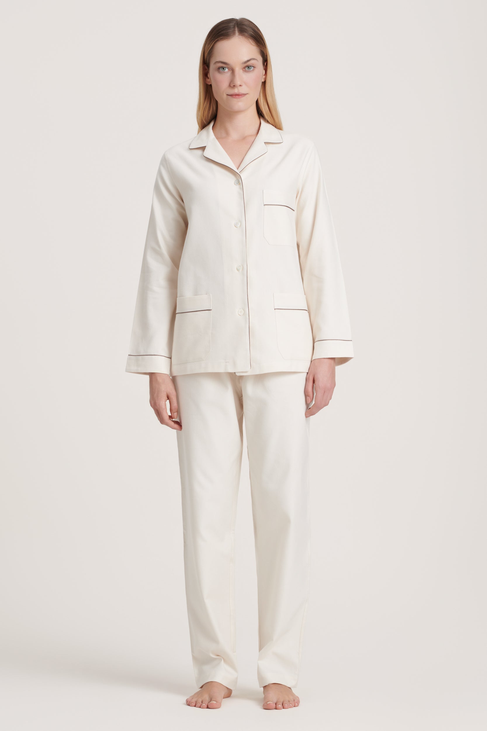 Italian ivory cotton flannel pajama with brown piping. Soft, relaxed, and thoughtfully comfortable, offering quiet luxury and refined ease. Made in Italy.