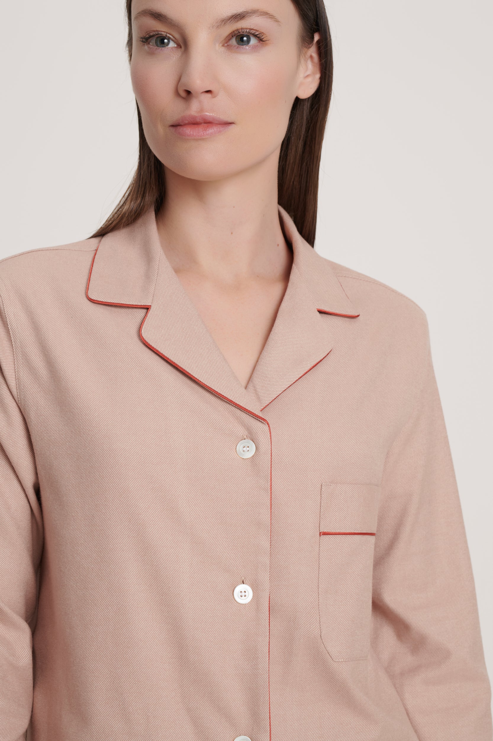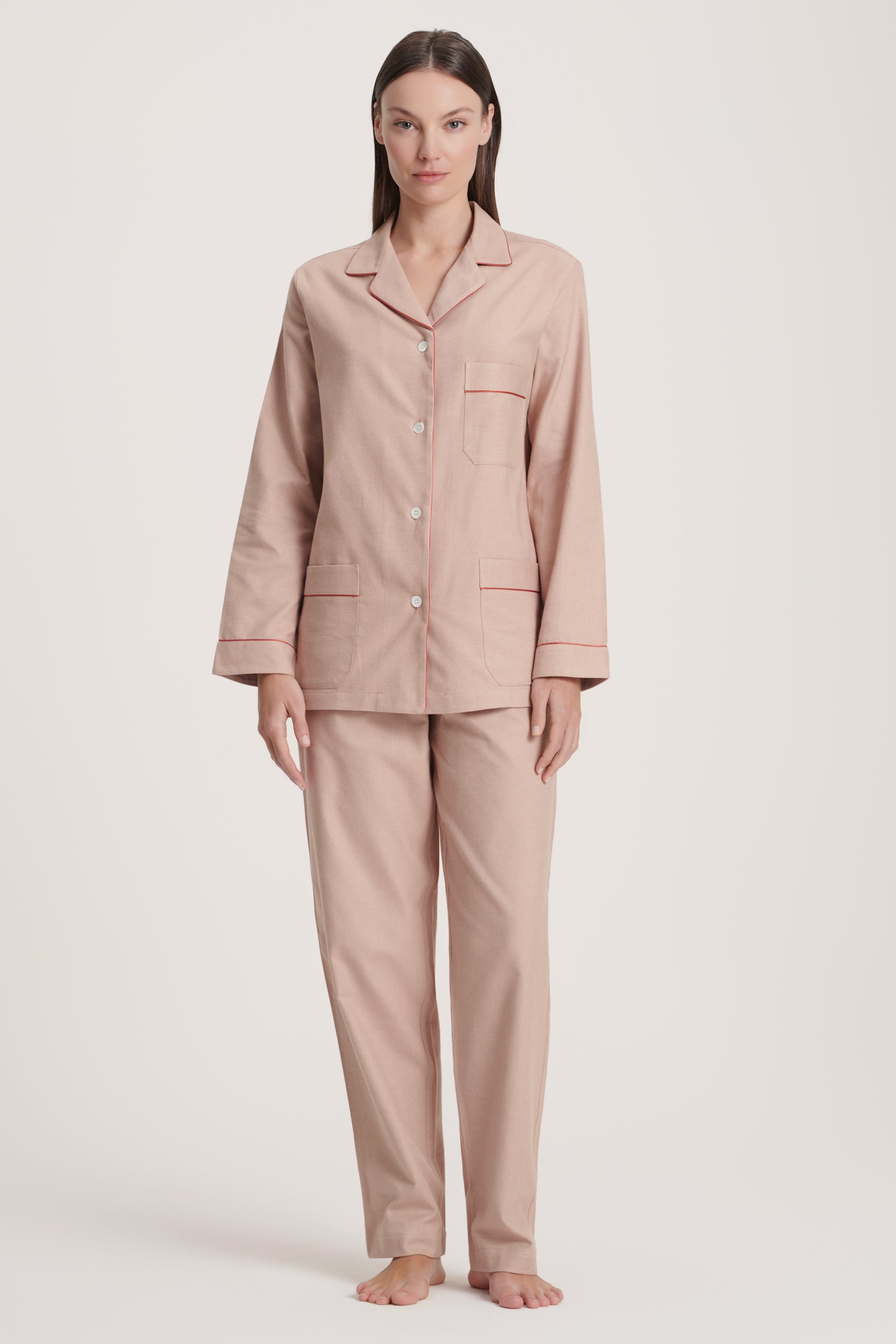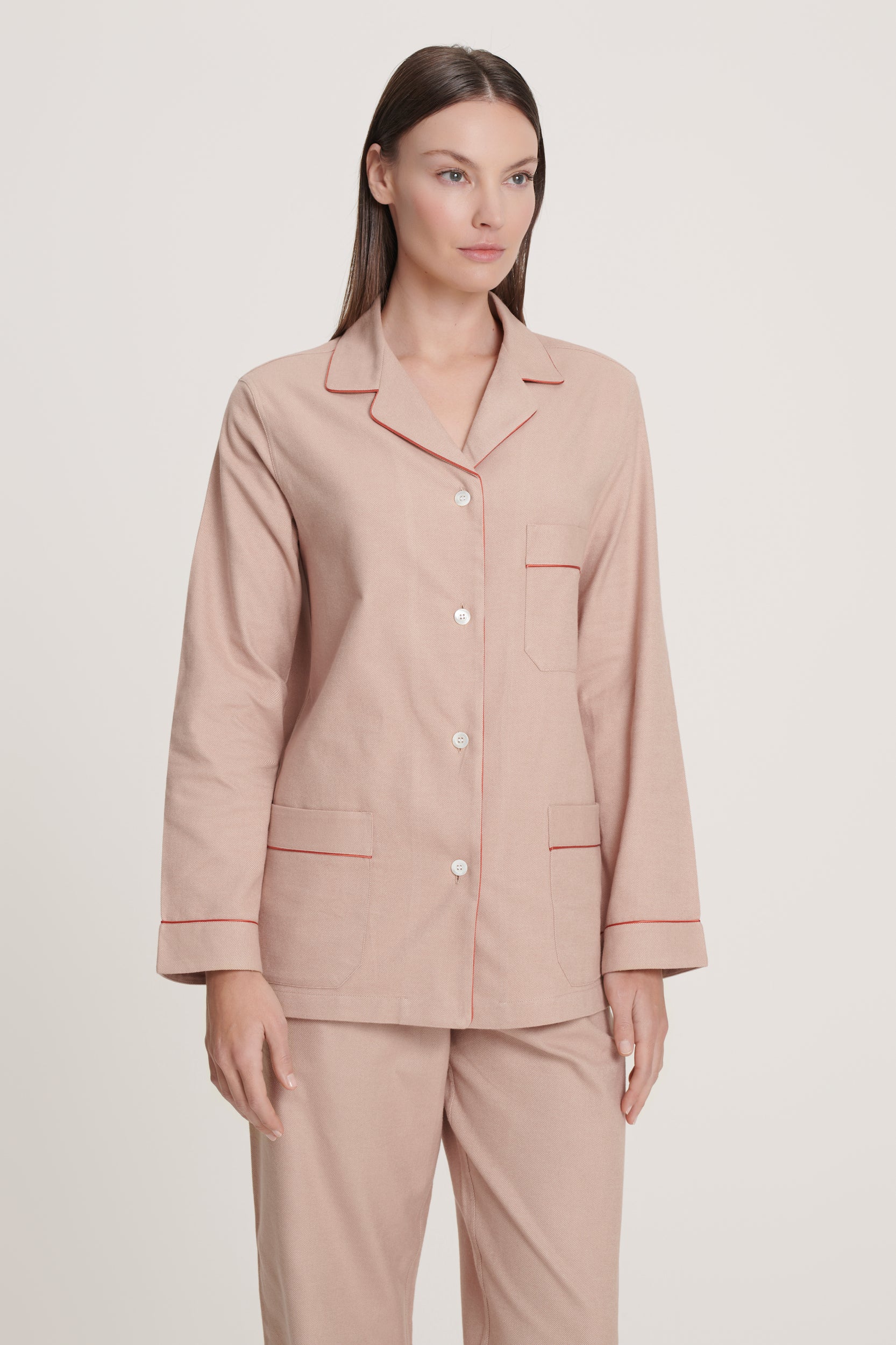 The sand tone gives this flannel a clean, pared-back look — understated but with a presence that feels distinctly modern. The cotton carries itself with an easy structure, offering comfort while keeping the lines crisp. Straightforward, unfussy, and refined in its simplicity, it’s a pajama that suits anyone who prefers clarity over fuss