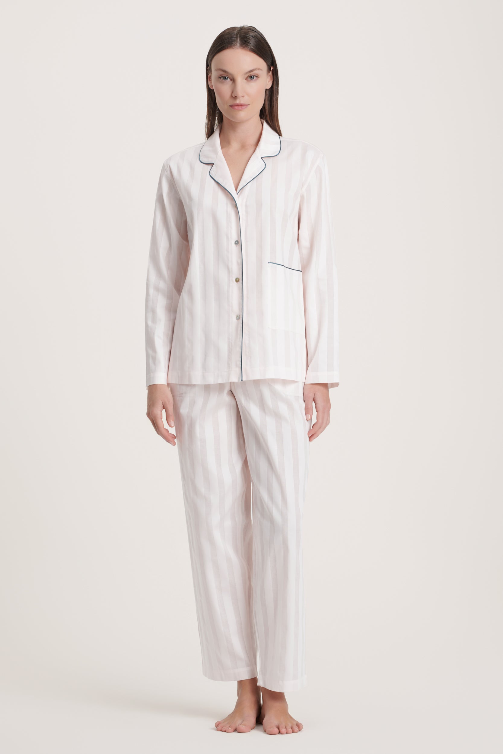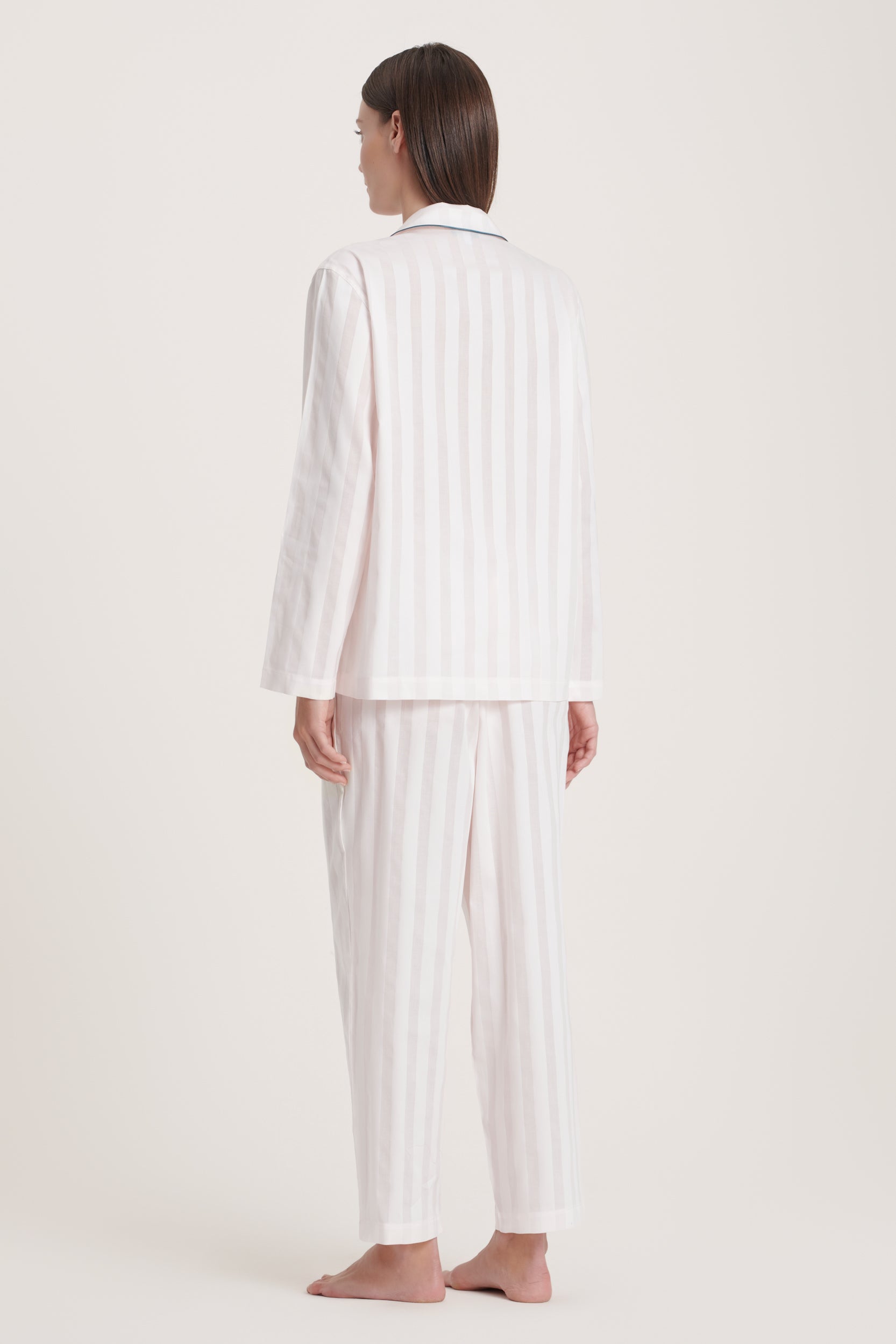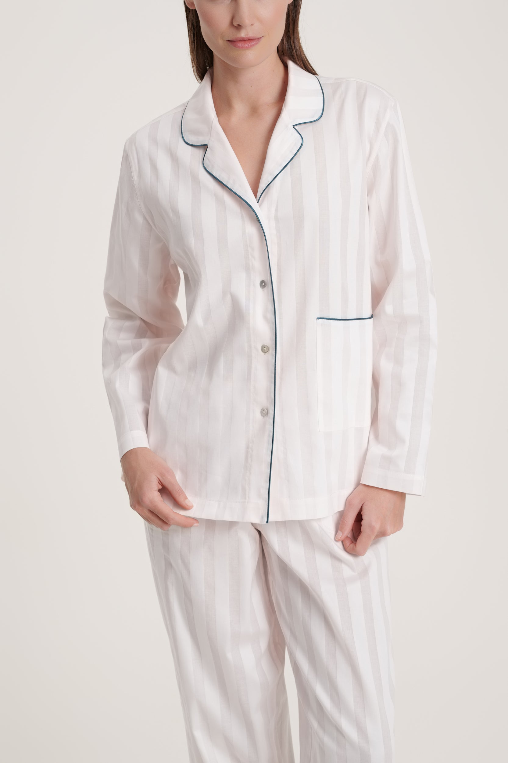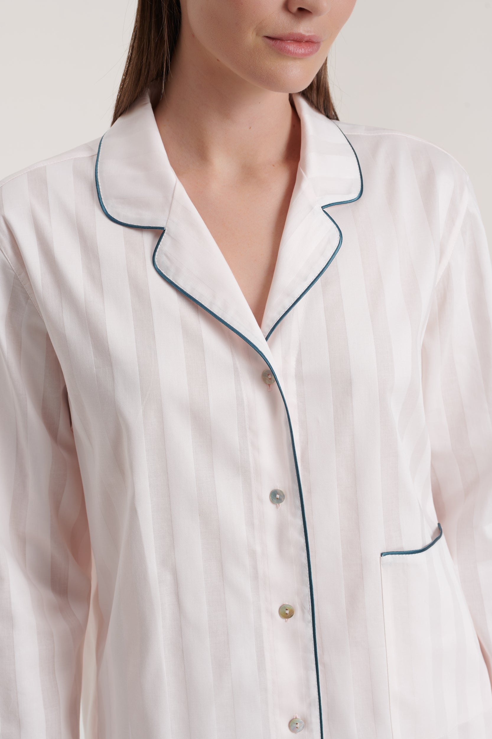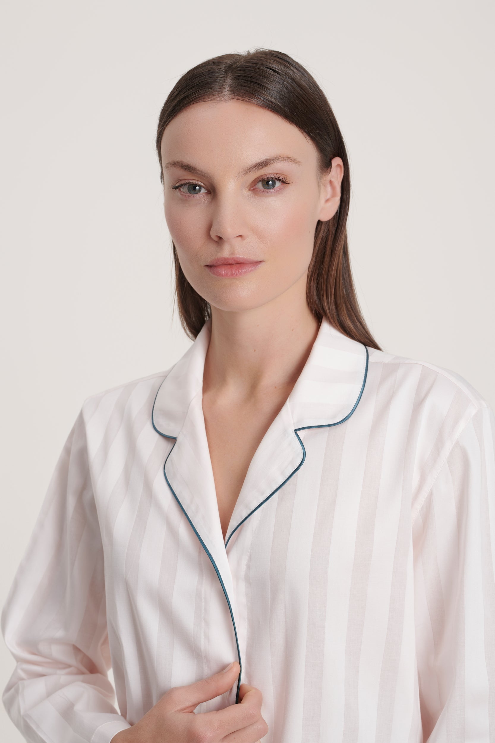 Italian 100% cotton pajama set with delicate satin-stripe weave, soft, breathable, and luminous, bringing quiet elegance to everyday moments. Made in Italy.