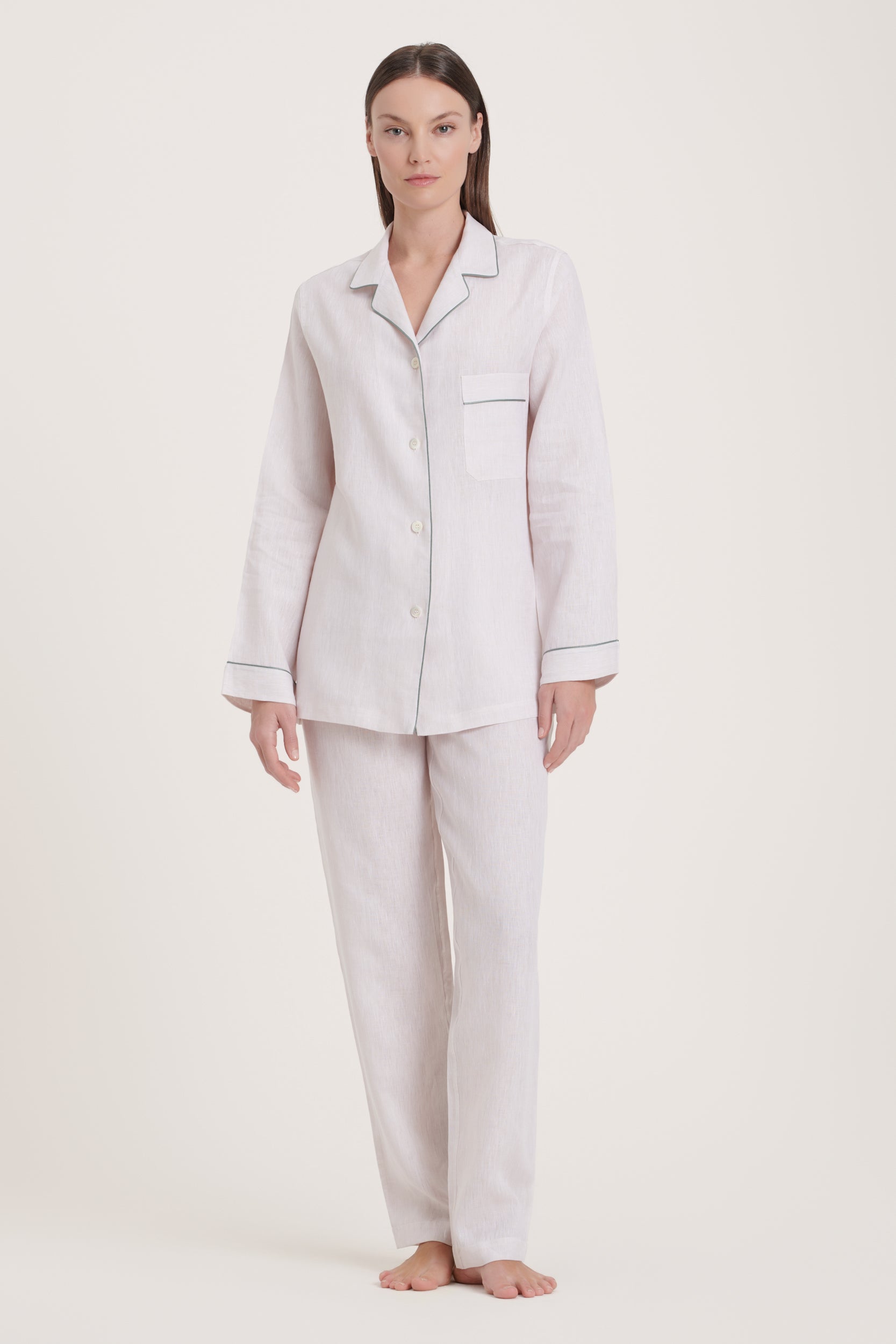 Italian pure linen pajama set in ivory with navy piping. Polished and quietly confident, perfect for eveyday moments of refined comfort. Made in Italy.