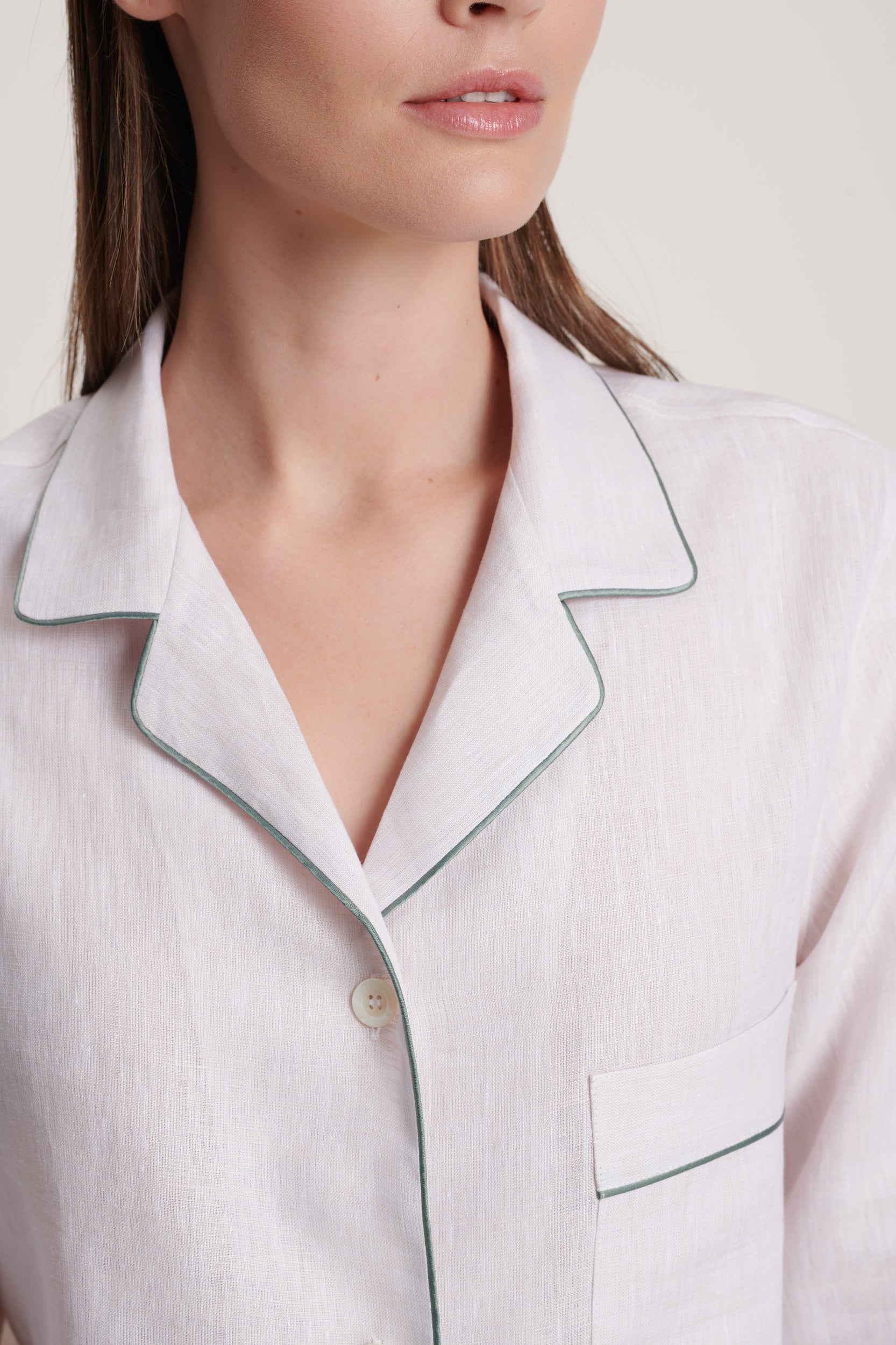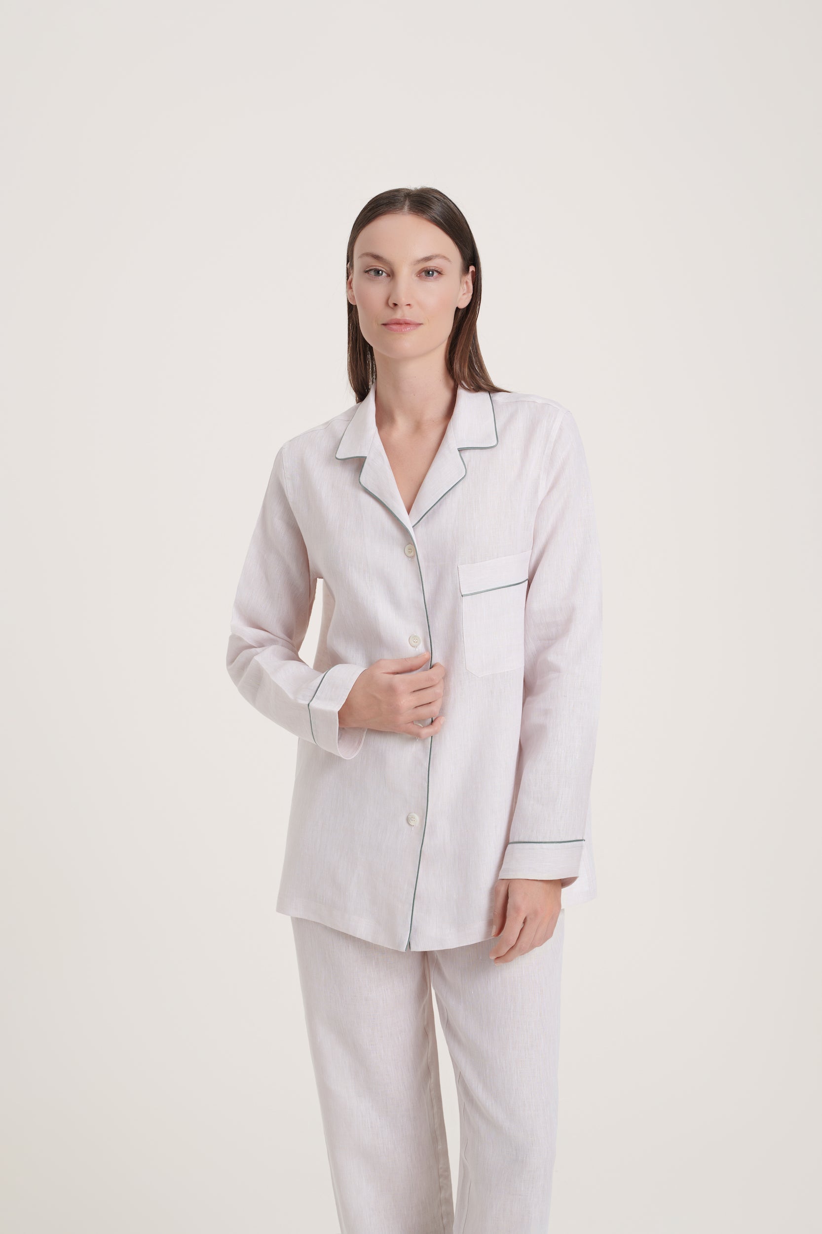 A linen set with a calm, polished tone — the ivory base feels soft and timeless, lifted by a line of navy piping that adds just the right amount of definition. Cool, refined, and quietly confident, it’s a pajama that suits any moment of the day.