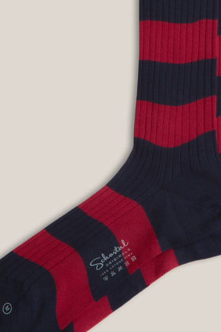 Striped Pima Cotton Ribbed Socks - Extended Mid-Calf - Navy & Carmine