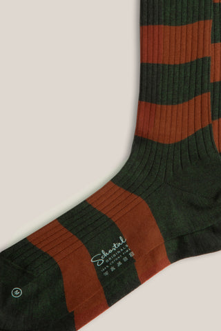 Striped Pima Cotton Ribbed Socks - Extended Mid-Calf - Moss green & Tobacco
